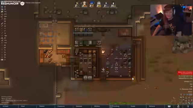01:52:42Der Streamer wechselt zu einem praktischen Gameplay-Abschnitt mit 'RimWorld'. Nach einer längeren Pause wird die fortgeschrittene Kolonie wieder ins Visier genommen. Es gibt konkrete Baupläne für die nahe Zukunft, einschließlich der Vervollständigung einer Granitmauer zum Schutz der Siedlung. Darüber hinaus wird der Bau einer Verteidigungsanlage mit Fallen erwähnt, die diagonal angeordnet werden sollen, um gegnerische KI-Einheiten in eine Falle zu locken und den eigenen Siedlern einen günstigen Angriffspunkt zu bieten. Der Fokus liegt auf strategischer Vorbereitung für bevorstehende Angriffe.