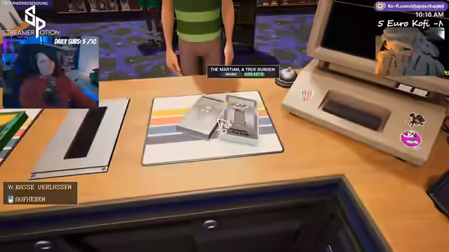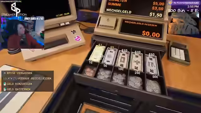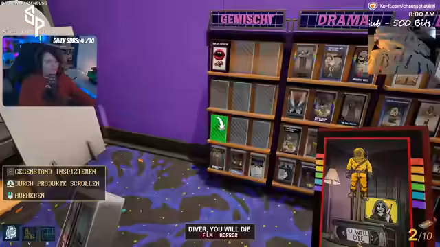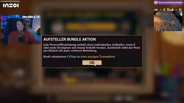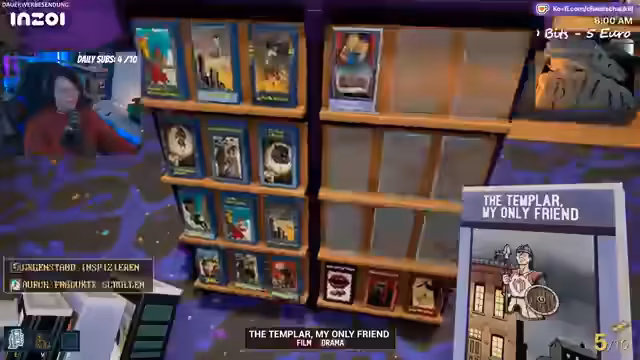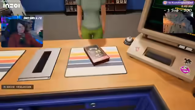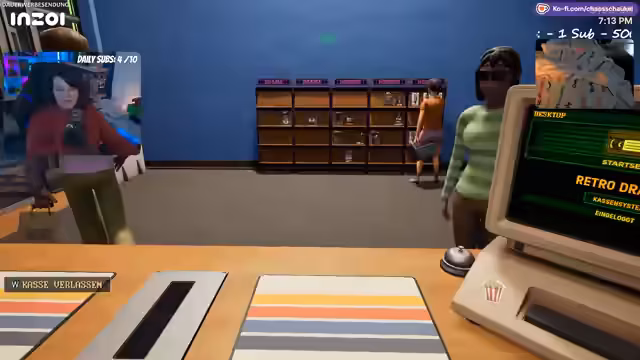 02:38:02Nach dem Merchandising für Mini Chaos wechselt der Stream zu Retro-Video-Store-Simulator. Das Spiel beginnt im Jahr 1990 und der Spieler ist der Besitzer einer Videothek. Zunächst müssen Regale aufgestellt, Filme aus einem Katalog bestellt und der Laden eingerichtet werden. Es gibt ein Kassensystem, einen Filmkatalog und Mitarbeiter. Die Kunden bewerten Filme, und die Herausforderung besteht darin, die Filme entsprechend ihrer Kritik in den Regalen zu platzieren und während des Tagesbetriebs zu verwalten.