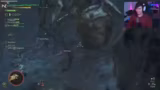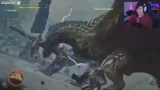 02:18:16Der Streamer kämpft gegen ein großes Monster, den Wolfsmenschen, und stellt dessen beeindruckende Größe fest. Er versucht, den Kopf zu treffen, wobei ein Fangnetz als taktisches Element ins Spiel kommt. Während des Kampfes wird der Streamer von den Bewegungen des Monsters eingeschüchtert. Er bemerkt animierte Lebensanzeige, die bei niedriger Lebensenergie stark wabbeln, als visuelles Warnsignal.