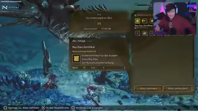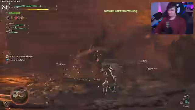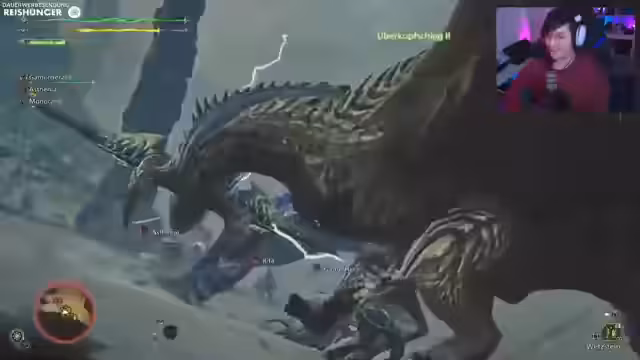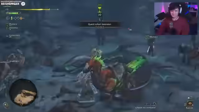 04:51:16Im Kampf gegen einen großen Riesenaffen-ähnlichen Monster greift der Streamer mit seiner Axt an. Er bemerkt, dass Monster neue Verhaltensweisen zeigen, wie das Festfrieren am Boden, was eine neue Möglichkeit zur Attacke bietet. Der Fokus liegt auf Teamplay, wobei ein Mitspieler als Heiler agiert. Es werden Gegenstände wie Dungbomben und Kälgetränke strategisch eingesetzt, um Gegner zu kontrollieren und Schaden zu minimieren. Das Ziel ist es, die Monster nicht zu besiegen, sondern sie aus einem Gebiet zu verteidigen, was einen einzigartigen taktischen Aspekt darstellt.