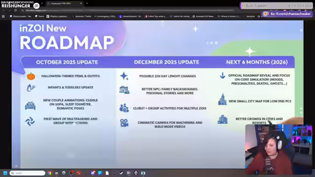 chaosschaukel meldet sich zurück mit Giveaways für inZOI und Voyagers of Nera. Es wird Voyagers of Nera gespielt, für das Keys und ein Server verlost werden. Der Streamer teilt Überlegungen zu Sims 4 Add-ons und diskutiert Erfahrungen mit Höhenangst, Fensterputzen, Heizsystemen und der aktuellen Wohnsituation. Persönliche Routinen und Vorlieben werden thematisiert, ebenso wie die Ablehnung von Ballermann-Inhalten und Hassreden. Der Streamer plant zukünftige Streams und Kooperationen und verlost Keys. Es wird über Ernährungsgewohnheiten, Abnehmprodukte und Toleranz gegenüber anderen Ernährungsweisen gesprochen. Das PC-Setup und Grafik-Präferenzen werden erläutert, und es gibt einen Raid von Gunnar. Die Küchenrenovierung wird erwähnt und die Vorfreude auf InZOI geteilt. Mods für InZOI werden vorgestellt und es gibt technische Probleme mit Mods. Die Streamerin erkundet neue Mods und Dekorationen in InZOI und deinstalliert Mods. Es wird nach der Flamingo-Bar gesucht und eine Giveaway-Aktion für InZOI Base Game und Kahaya-Hemden gestartet. Zollinformationen für Gewinner werden gegeben und Feedback wird erbeten. Es gibt Größenhinweise für koreanische Kleidung und es werden In-Zoi Spielerfahrungen geteilt. Ein Zwischenfall mit einem Hundebiss wird geschildert und der morgige Stream-Plan wird angekündigt. Es gibt Giveaway-Planung und Gameplay-Eindrücke. InZOI: Bonsai-Business und Modding-Probleme werden thematisiert. Es gibt Baumodus-Frust und Gameplay-Verbesserungen in InZOI. Es gibt Interaktion und Lebendigkeit der Spielwelt in InZOI. Detlefs Abenteuer und neue Funktionen im Spiel werden gezeigt. Sims-Fähigkeiten, Addons und Kritik an Sims 4 werden geübt. Es gibt interaktive Elemente und Gameplay-Überlegungen in InZOI. Fitness, Finanzen und Gameplay-Details in InZOI werden besprochen. Der nächste Stream und Giveaways werden angekündigt.