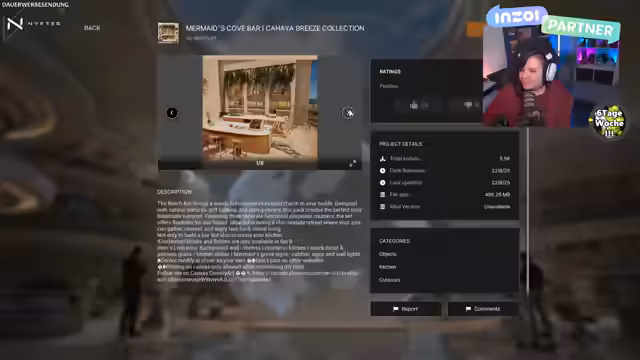 02:50:09Die Streamerin erkundet neue herunterladbare Inhalte (Mods) in InZOI, darunter Surfbretter für die Wand und verschiedene Spiegel. Sie findet die Spiegel interessant, besonders deren Qualität und Spiegelung, obwohl sie nicht dieselbe Spiegelung wie andere Spiegel im Spiel haben. Sie behält die Spiegel als Deko. Weiterhin werden Pflanzen mit Bottichen betrachtet, wobei die Streamerin die sichtbaren Grafikübergänge bemängelt. Ein Seestern wird als süß und gut verarbeitet befunden. Ein Bild im Mod-Shop überzeugt durch seine Qualität, die den Vorschaubildern entspricht. Halloween-Deko wird als süß empfunden, obwohl es nur ein Motiv gibt. Eine Lampe wird getestet, zeigt aber Probleme im Live-Modus, da sie bei zu nahem Heranzoomen verschwindet und nicht leuchtet, was zur Entscheidung führt, sie nicht zu behalten. Eine Mermaid Cove Bar wird begutachtet, wobei die Steintextur der Kissen überrascht, da sie auf den Bildern wie Holz aussah. Ein Schiff wird als knuffig empfunden, aber die Textur wirkt zu sauber. Kissen, die zum Set gehören, haben nicht das erwartete Design und können nicht umgefärbt werden, was zur Folge hat, dass das gesamte Set wahrscheinlich entfernt wird. Hübsche Schaukeln in verschiedenen Farben werden gezeigt, ebenso Tische mit unterschiedlichen Designs, die gut zum Strand passen, darunter ein Muscheltisch mit einer Perle.