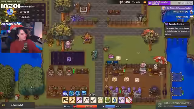 04:02:06Der Streamer interagiert mit NPC-Charakteren, darunter seiner Ehefrau Vivi, und beschenkt sie mit blauen Blumen oder Saphiren, die die meisten Charaktere mögen. Er erwähnt, dass er Geschenke für mehr Herzchen sammelt und dass die Ehepartner oft in Sunhaven wohnen. Zudem geht es um die Vorbereitung von Geschenken für andere Charaktere wie Wesley, der blauen Honig oder Blaubeersaft mag, und um das Sammeln von Ressourcen wie Wolle und Holz für die Farm.