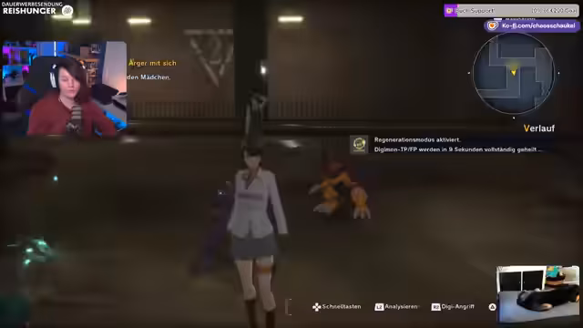 01:32:19Der Fokus liegt auf der Erkundung und dem Kampf. Die Streamerin steuert ihre Agentin durch die Map und kämpft gegen wild Digimon. Sie stellt fest, dass es Champion-Stufe Digimon sind, die viel aushalten. Nach dem Kampf lernt sie das Digitationssystem kennen, bei dem ihre Digi-Mon in stärkere Formen wechseln, aber wieder auf Level 1 starten. Sie erhält das Glubschimon und kann es zu Pagomon entwickeln. Das Persönlichkeitssystem, das durch Interaktionen verändert wird, ist neu und noch unverständlich.