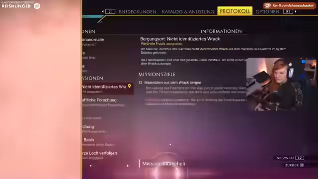 08:01:12Es wird festgestellt, dass ein Wasserschutzmodul fehlt und eine Landestation gebaut werden muss, obwohl bereits eine vorhanden ist. Für den Bau werden ein Ion-Akku, Prozessoren und Metallplatten benötigt. Ein Fusionsbeschleuniger wird geschenkt bekommen. Eine Quest wird aktualisiert und Koordinaten auf der Sternenkarte werden angezeigt, die sich auf einer anderen Welt befinden. Die Quest-Einblendungen werden als genauer und ersichtlicher empfunden. Ein neues System wird entdeckt und die Stationen werden als cool und leicht zu durchlaufen empfunden. Kabelbaum-Sachen werden gekauft und verkauft. Ein unentdeckter Planet mit aggressiven Wächtern wird gesichtet. Es wird erwähnt, dass man Flotten upgraden kann, damit sie schneller wiederkommen. Die Streamerin kann jetzt zwei Tipis mit ihren Schiffen herbeirufen, die im Weltraum helfen. Es wird festgestellt, dass die falsche Route gewählt wurde und der Planet für die Nebenquest bereits entdeckt wurde. Die Markierung für die Quest ist verschwunden und es wird vermutet, dass das Spiel buggy ist. Ein schwarzes Loch wird angesteuert, um 841.000 Lichtjahre zurückzulegen.