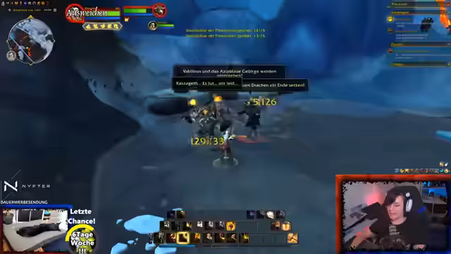 06:01:06Die Quests in der Dragonflight-Erweiterung standen im Fokus. Es wurden mehrere Questreihen durchgeführt, darunter eine, die zu den blauen Drachen und dem Aspekt Kalegos führte. Ein zentrales Ereignis war die Interaktion mit dem Charakter Kirigosa, deren Rückkehr als triumphaler Moment gefeiert wurde und die Stimmung des Streams aufhob. Auch die Handlung rund um die Verhüllten Archive und die Befreiung von Syndragosa wurde weiterverfolgt.