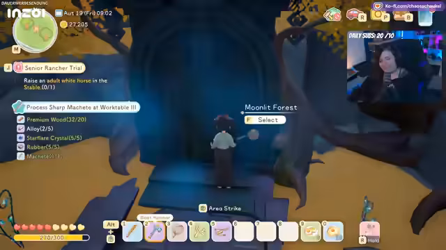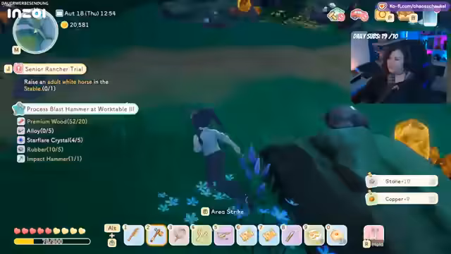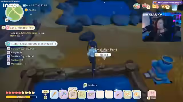 02:24:26Zu Beginn des Streams konzentriert sich die Aktivität auf die Organisation des Farm-Systems. Der Streamer kümmert sich um die Bewässerung der Felder und stellt fest, dass das Wasser leer ist. Es folgt eine panische, aber auch gestaltende Gartenarbeit, die im Housing-System für Frust sorgt, aber äußerlich ansprechend wirkt. Parallel dazu werden Ressourcen wie Honig verkauft und die Farmfläche wird überlegt erweitert, um Platz für die Tierhaltung zu schaffen.