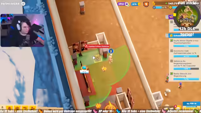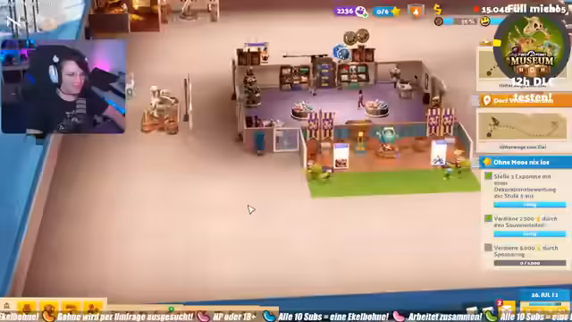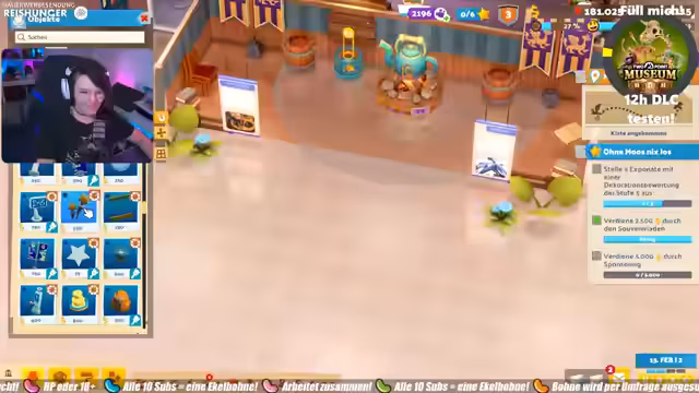 02:35:23Nachdem das Café eröffnet wurde, konzentriert sich der Streamer auf die Gestaltung des Museums. Es werden verschiedene Tapeten und Böden ausprobiert, um ein passendes Ambiente zu schaffen, und eine lila Tapete wird als besonders ansprechend empfunden. Später wird eine Ente als neue Deko entdeckt, die ins Konzept passen würde, aber aufgrund von Platzierungsproblemen und fehlender Geldmittel vorerst nicht platziert werden kann. Ziel ist es, ein Fantasy-Thema zu etablieren, das sich wie ein Schloss anfühlt.