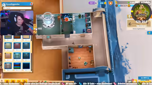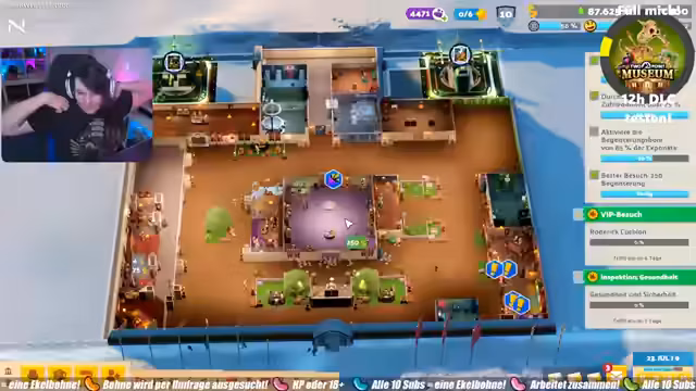 01:21:15Der Stream beginnt mit dem Start eines neuen Museums auf einer Schnee-Map. Zentrale Aufgabe ist der Aufbau eines attraktiven Museums mit verschiedenen Räumen wie einer Teestube, einer Schatzkammer und einem Analysebereich. Es werden passende Einrichtungsgegenstände wie Banner, Fackeln, Bänke und Bodenbeläge gesucht und platziert. Dabei wird auf ein stimmiges Fantasy-Deko-Konzept geachtet und versucht, durch ansprechende Gestaltung die Attraktivität für Gäste zu erhöhen und gleichzeitig die Finanzierung sicherzustellen.
