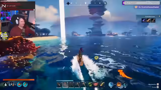 04:26:03Die Streamer starten die Kämpfe gegen die Abyss-Türmchen mit den vorbereiteten Verderbnissalben. Die Gegner, insbesondere die Haie, erwiesenermaßen auf Level 16 als sehr stark und schadenstoll. Nachdem die Türmchen erfolgreich beseitigt sind und die Karte weiter zugänglich wird, entdecken die Streamer eine Insel mit einem Geist. Dieser kann vorerst nicht gerettet werden, da ein Gleiter mit spezifischen Materialien wie Windsträngen erforderlich ist. Die Erkundung unter Wasser gestaltet sich als anspruchsvoll und erfordert Vorsicht.