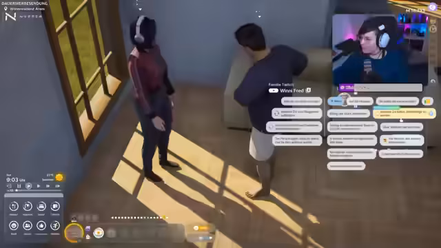 05:26:38Der Stream konzentriert sich auf das daily-life-Management der Charaktere, insbesondere die durchgeführten Tauschaktionen von Büro und Badezimmer. Die Figuren zeigen eine hohe emotionale Bande und interagieren intensiv. Sie putzen das gemeinsame Zuhause, erkunden ihre Fähigkeiten und ihre Berufe. Ein zentrales Highlight ist die spontane Rettungsaktion, bei der Chaos in ihrem Schlafzimmer eingeschlossen wird und befreit werden muss, was dem realistischen Charakter des Spiels Rechnung trägt.