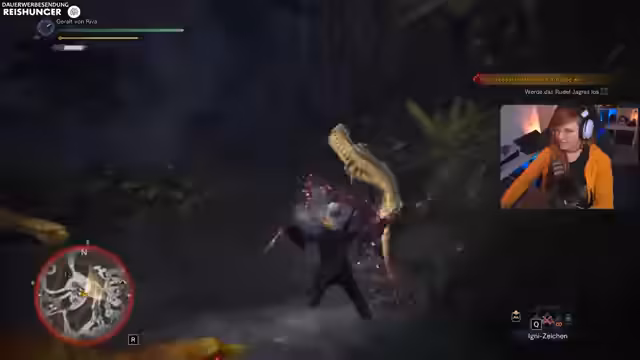05:38:23Nach dem Auffinden des verletzten Forschers wird der Hauptgegner, der Waldschratt, gefunden. Der Kampf beginnt, bei dem der Waldschratt aggressive Vögel herbeiruft und mit telekinetischen Wurzeln angreift. Geralt muss seine Waffen schärfen und sich den Angriffen ausweichen, während der Streamer die Kampfmechaniken kommentiert und die Schwierigkeit des Kampfes anspricht.