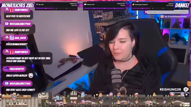 02:28:40Die Streamerin begrüßt ihre Zuschauer und bereitet sich auf den Gaming-Teil des Streams vor. Sie sammelt ihre Quests in Fantasy Live ein, speichert und beendet das Spiel, um es dann neu zu starten. Der Chat hat sich für Fantasy Live entschieden, was sie freut, da sie momentan selbst süchtig nach dem Spiel ist. Sie erwähnt, dass ihr Hund Rita oft auf der Couch liegt. Im Spiel plant sie, die gestern gesammelten Silbererze zu verarbeiten und bietet an, mit den Zuschauern Gigantchen oder Bäumchen zu farmen, unabhängig vom Level. Ihre Angel-Lady hat fast alle Power-Ups vollständig. Sie hat sich neue Frisuren und Gesichter für ihren Charakter gekauft, die mit einem neuen Kit hinzugefügt wurden. Fantasy Live ist für PC, PlayStation und Switch verfügbar, und sie überlegt, es sich in Zukunft auch für die Switch 2 zu holen. Sie zeigt die neuen Frisuren und Augen, die sie erworben hat, und diskutiert über die Auswahl der besten Kombinationen. Sie betont, dass sie gerne mit den Zuschauern gemeinsam im Spiel unterwegs ist und dass sie früher regelmäßig Gigantchen-Streams gemacht haben.