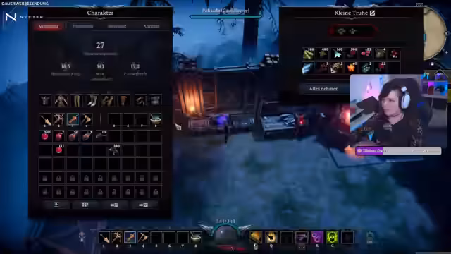 05:29:40Ein Kampf am Tag gestaltet sich schwierig, da der Streamer im Freien sterbt und zum Schnellreisepunkt zurückkehren muss. Sein Hund wird als Grund für die Ablenkung genannt. Rückkehr am Nachmittag wird der Streamer von einem Schurken angegriffen und muss sich in den Schatten zurückziehen. Trotz des Rückschlags gelingt es, vier zusätzliche Wettsteine zu looten, die ausreichen, um eine zweite Malstation zu errichten und so die Ressourcenproduktion zu steigern.