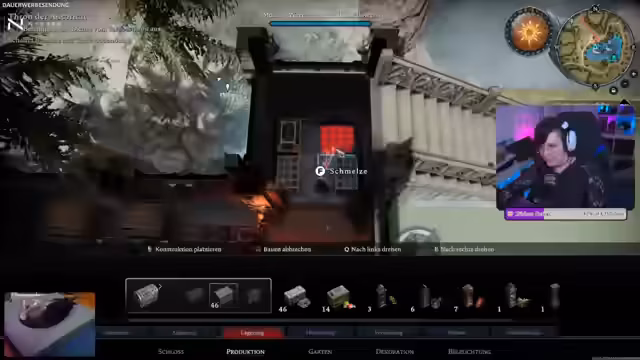 05:09:56Nach dem Sieg über den Boss Lydia wird die nächste Aufgabe definiert: Der Bau eines kleinen Raums im Schloss. Hierfür werden Steine, Bretter und Wettsteine benötigt. Die Werkbänke laufen bereits auf Hochtouren, um Ressourcen für den Ausbau der Basis zu produzieren. Der Streamer plant, kurze Spaziergänge in der Wildnis zu machen und schließlich weiter nach Eis zu reisen, nachdem er seine Basis etwas erweitert hat.