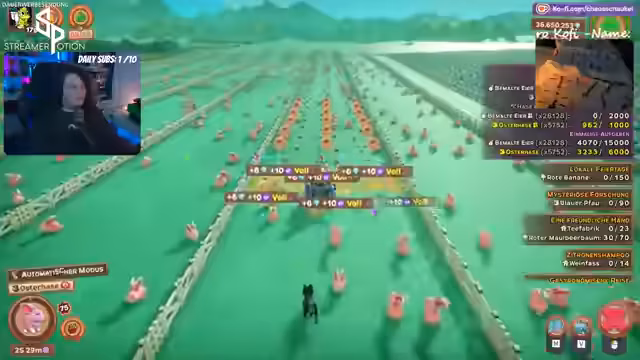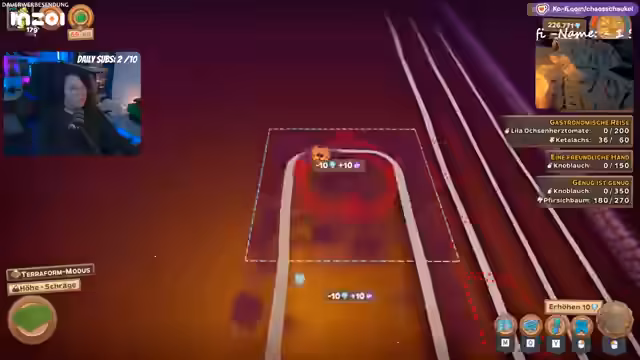01:17:25Zu Beginn des Streams werden technische Probleme mit einem Twitch-Bot angesprochen. Das Streamer-Team kann plötzlich keine Spielkategorie mehr ändern, was den Streamer wahnsinnig macht. Parallel dazu wird das Spiel Farm Together fortgesetzt, wobei das Zurückholen von Event-Dekorationen priorisiert wird. Die Farm wurde zuvor komplett abgerissen, um Platz für eine Neugestaltung zu schaffen, was nun den großen Planungsprozess einleitet.