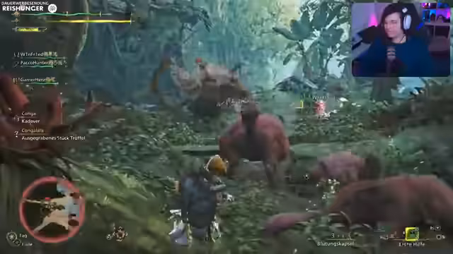 04:10:40Der Streamer kommentiert, dass die Monster nicht fliehen können und freut sich, dass man sie fangen darf. Es wird festgestellt, dass ein anderes Monster despawnt ist. Es wird über die Möglichkeit diskutiert, Monster in den Schlaf zu versetzen, um sie leichter zu fangen. Der Streamer äußert sich positiv darüber, dass Monster zusammen auftreten können, und lobt die Übung, die das Team bereits hat. Nach der Monsterjagd werden Event-Quests in Angriff genommen und Nebenaufgaben angenommen. Es kommt zu einem Verbindungsfehler, aber das Problem scheint sich schnell zu lösen. Der Streamer nimmt eine neue Quest an, bei der es um einen Gipzeross geht, und bespricht mit den Zuschauern, welche Event-Quest als nächstes gemacht werden soll. Es wird erklärt, welche Quest für den Helm benötigt wird. Der Streamer sammelt Items und Pilze, wobei er feststellt, dass er die anderen Items noch freischalten muss. Es wird darauf hingewiesen, dass die Lager oft voll sind, weil die Leute sie noch nicht abgerissen haben. Der Streamer überlegt, wo er seine Lager sinnvoll platzieren kann. Es wird erklärt, dass man mit dem Netz auch Blitzkäfer und Bitterkäfer fangen kann, aber dann nicht ihr Sekret bekommt. Es wird über die korrekte Methode zum Sammeln von Käfern diskutiert.