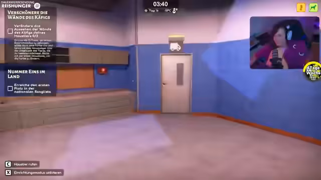 06:45:57Das Tierheim bereitet sich auf den Tag der offenen Tür vor, neue Gehege werden freigeschaltet und dekoriert. Ein Notfall führt zu der Aufnahme einer neuen Katze namens Mystic, die verängstigt erschöpft wirkt. Gleichzeitig stellt der Streamer fest, dass die Heizstrahler in den Zwingern nicht ausreichend funktionieren, was eine ernste Gefahr für die Tiere darstellt, da es nur drei Grad hat. Die Temperaturkontrolle wird als entscheidend für das Wohlbefinden der Tiere identifiziert.