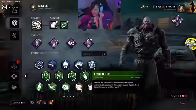11:38:54Der Streamer beginnt das Dead-by-Daylight-Spiel mit dem Killer Nemesis. Wichtig für den Loadout ist der Blood-Perk 'No Way Out', der die Tore versperrt. Er testet verschiedene Add-ons und Perks wie 'Brutal Strength' und 'Outbreak', um die Tore schneller zu zerstören und Überlebende in der Nähe zu markieren. Der Fokus liegt auf effektiven Strategien für den Sieg, während er auf die Lobby wartet und über die Veränderungen im Spiel spricht.