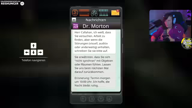 02:10:16Nach einer anstrengenden Schitt wird der Tag mit dem Erreichen der vorgegebenen Ziele beendet. Der Streamer fährt mit dem Zug nach Hause und zeigt die spartanische und verdreckte Mietwohnung der Familie. Hier findet er eine Kiste mit alten Tabletten, Bilder seiner toten Frau und eine verzweifelte Notiz. Ein PC erlaubt die Kontaktaufnahme mit Dr. Morton, was auf die psychologischen Aspekte des Spiels hindeutet.
