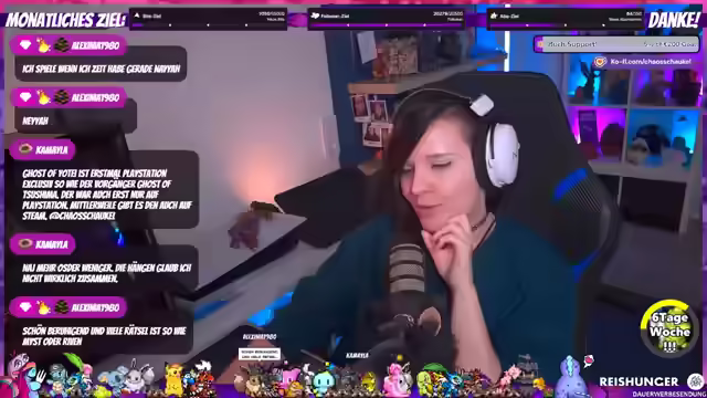 00:30:16Es wird festgestellt, dass das aktuelle Spiel neue Subscriber anzieht. Es wird ein Sub-Push-Wochenende angekündigt, bei dem es für jede Fünferbombe kleine Aufklebetattoos im Kinder-Style gibt. Die Zuschauer können sich einen Bogen aussuchen, von dem sich die Streamerin dann ein Tattoo aufklebt. Es gibt verschiedene Motive wie Piraten, Einhörner, Feen und Monster. Es wird betont, dass es keine Bohnen mehr geben wird, da die Streamerin diese nicht mehr sehen kann. Für das kommende Wochenende sind Horror-Games geplant, darunter The Midnight Walk und zwei Spiele von Alexinia: Luto und Silent Still 2, das sich mit Schlafparalyse beschäftigt. Rapid soll die Streamerin wieder schminken, wie bei einem früheren 24-Stunden-Stream, wo es Cosplay und Verkleidungen gab.