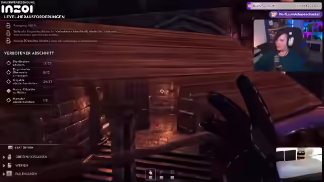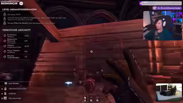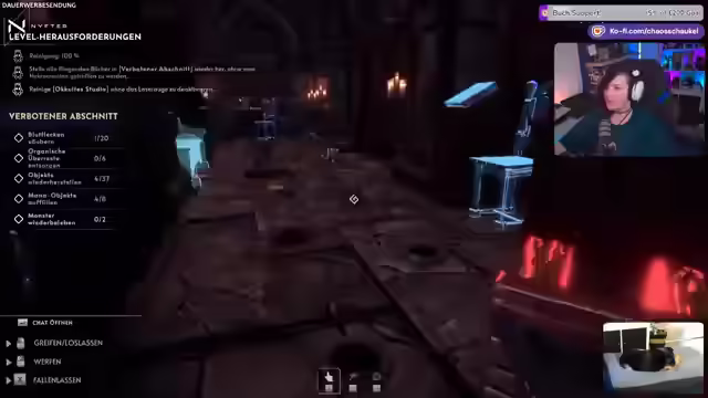 07:04:12Der Altar wird für die Wiederbelebung vorbereitet. Die Gruppe betritt eine Bibliothek und entdeckt fliegende Bücher, die aufgespießt werden müssen. Vorsicht ist geboten, da sich in der Bibliothek viele Druckplatten befinden, die Stacheln auslösen. Die Gruppe versucht, die Funktion der Druckplatten zu verstehen und gemeinsam zu agieren, um nicht von den Stacheln getroffen zu werden. Es wird eine Mimik vermutet. Eine Kirchenbank muss platziert werden. Die Gruppe versucht, die Druckplatten zu identifizieren und zu vermeiden. Ein Stuhl wird gefunden, der für den Raum benötigt wird. Es wird Blut gereinigt. Es wird festgestellt, dass Möbel die Druckplatten aktivieren, wenn sie geworfen werden. Eine Notiz für den Boss wird gefunden, die besagt, dass man nicht springen und nicht ducken soll. Der Boss schläft auf einem Stuhl und muss aufgeweckt werden. Die Gruppe vermutet, dass sie springen und ducken muss, um den Boss zu besiegen.