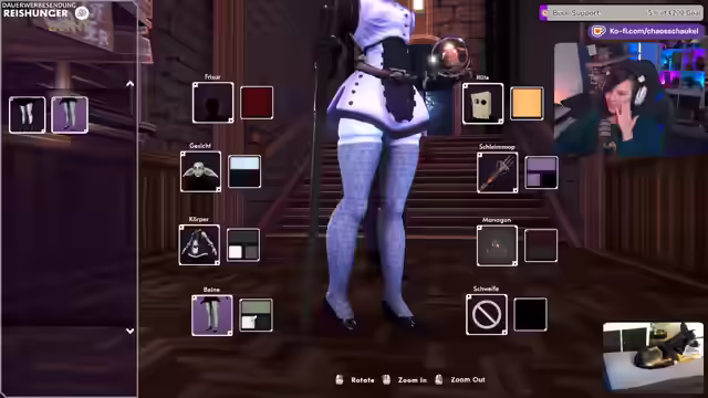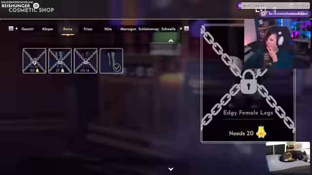 07:59:47Der fehlende Schlüssel wird gefunden, nachdem er aus der Tür genommen und zurückgesetzt wurde, damit die Helden ihn selbst finden können. Der Charakter erinnert optisch an die Vampire aus Shadowlands, insbesondere an das Venture-Venthyr-Setting. Nach der erfolgreichen Schlüsselsuche folgt ein Besuch im Shop, wo neue Frisuren, elegante Körper, Gesichter und Schleim-Mobs entdeckt werden können. Besonders interessant sind die Katzenschwänze, Hasen und Drachen. Die Haarfarbe ändert sich durch das Gesicht, was als fies empfunden wird. Es werden neue Schuhe und Ritterrüstungen entdeckt, und der Charakter verwandelt sich in eine Mietzekatze. Die hautengen Strumpfhosen und unpraktischen Schuhe werden humorvoll kommentiert. Nach dem Shopping-Ausflug wird eine kurze Pause eingelegt, um die Mietze zu füttern und Kaffee zu kochen.