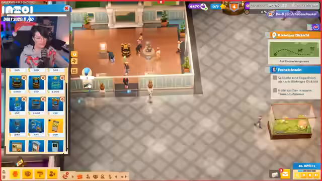 01:33:10Die Einstellung von Wildtier-Experten über die Twitch-Erweiterung gestaltet sich schwierig und funktioniert vorerst nicht, sodass der Streamer auf NPC-Mitarbeiter angewiesen ist. Um Tiere aufnehmen zu können, wird eine Werkstatt benötigt, um Terrarien und Lebensräume zu bauen. Der erste Schritt ist die Behandlung eines erkrankten Tieres in einem neu eingerichteten Tierwohlzimmer. Das erste Tier, eine Schlange namens Carsten, wird erfolgreich behandelt und in ein Terrarium umgesiedelt.
