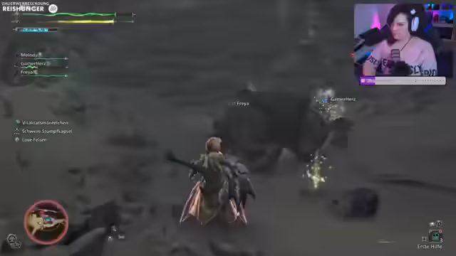 05:24:08Da die gehärtete Lala Barina nicht erscheint, wird aktiv die Community um Hilfe gebeten. Der Streamer bittet im Chat, wer eine offene Lala Barina-Quest hat und sie für die Gruppe öffnen kann. Parallel wird das System zur Markierung von Monstern mit Farbbällen erläutert, um diese bei Erscheinen gezielt jagen zu können. Die Kommunikation über offene Quests im Chat wird als essenziell für effizientes Farmen hervorgehoben.
