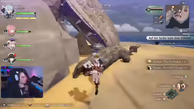 05:07:16Es wird zur Sommerregion teleportiert, um dort die Hauptquest fortzusetzen. Während der Erkundung werden neue Gegner, wie fliegende Monster, kennengelernt. Die Entdeckung unerreichbarer Bereiche deutet auf die spätere Verfügbarkeit einer neuen Fortbewegungsmethode hin. Eine Höhle wird als Ort für die anstehende Schwertmission identifiziert.