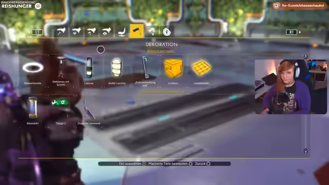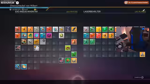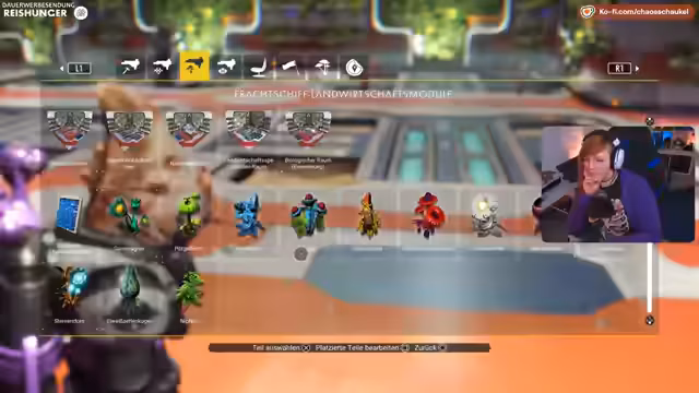 05:02:37Der Stream konzentriert sich auf den Ausbau des eigenen Frachters. Nachdem der Lagerraum durch die hergestellten Pflanzen stark an Kapazität verloren hat, beginnt der Bau verschiedener Module. Es werden technische Räume, ein Teleporter, ein großer Garten und Raffinerie-Module errichtet. Der Bau erfordert erhebliche Mengen an Ressourcen wie Silber, Kobalt und Wasserstoff, die teilweise direkt aus dem Lager des Frachters gezogen oder aber auf Planeten gefarmt werden müssen, da der Vorrat vorerst aufgebraucht ist.