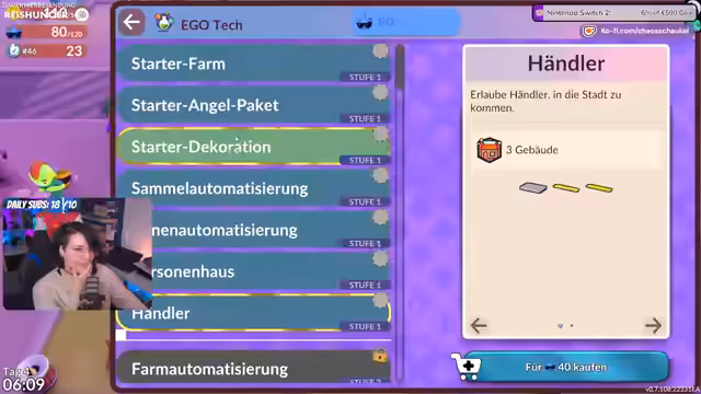 03:29:59Ein kürzliches Update hat das Verhalten der Bewohner im Bezug auf das Farmen und Angeln verändert. Früher produzierten sie im Überfluss, füllten Lager bis zum Rand. Nun produzieren sie nur noch das, was die Märkte tatsächlich benötigen, was zwar die Lagerhaltung vereinfacht, aber den massenhaften Verkauf von Überschüssen erschwert. Spieler können weiterhin selbst angeln, müssen jedoch darauf achten, dass die Angelplätze nicht blockiert werden, wenn Arbeiter sie benötigen. Es wird erwähnt, dass Angelplätze nun spezifische Fischarten anzeigen, was die gezielte Beschaffung erleichtert. Die Stadt wird mit verschiedenen Dekorationen wie Shuffle-Dingern, Brunnen und Bäumen verschönert, um die Attraktivität zu steigern und die Bewohner zufriedenzustellen. Neue Beleuchtungsoptionen und Zebrastreifen tragen ebenfalls zur visuellen Verbesserung bei. Der Streamer investiert viel in Dekoration, um die Stadtbewertung zu erhöhen, muss jedoch gleichzeitig auf die finanzielle Situation achten, um wichtige Freischaltungen nicht zu gefährden.