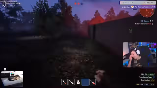 04:00:40Ein langsamer Rückzug wird zur Flucht vor der Polizei und den Bewohnern. Es entsteht hektisches Chaos, als die Streamer auseinandergerissen werden, verfolgt werden und sich in Todesfallen begeben. Die Jagd durch die Map erfordert schnelles Denken und Nutzung von Verstecken. Der Einsatz von Schlafgas wird diskutiert und die Taktik, im Kreis zu laufen, um Verfolger zu täuschen, wird angewendet. In der Konsequenz gehen viele Ausrüstungsgegenstände verloren.