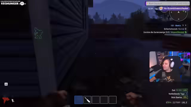 02:23:05Der Streamer beginnt mit einem riskanten Einbruch, bei dem er versehentlich einen Polizisten antrifft und fliehen muss. Beim Verlassen eines Hauses wird er entdeckt und muss mit einem Dosenöffner und schwarzer Maske fliehen. Die Situation eskaliert, als ein weiterer Bewohner auftaucht, und der Streamer entkommt nur knapp, indem er in einen LKW steigt. Er erwähnt, dass er Items wie ein versperrtes Handy und ein Radio gesammelt hat, betont aber, dass der LKW kein sicherer Ort ist.