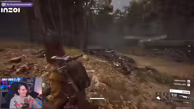02:17:08Während der Erkundung stößt das Team auf tote Spieler, deren Beute man looten kann. Die Streamerin fürchtet, dass der Lärm beim Plündern andere Spieler anlockt und sie angreifen könnten. Sie findet ein wertvolles blaues Teil, kann es aber aufgrund ihres vollen Inventars nicht mitnehmen. Ihr Co-Spieler Vini hingegen entscheidet sich, einen riskanten Turm zu erklimmen, um auf weiteres Loot zu warten, was die Streamerin als sehr gefährlich empfindet.
