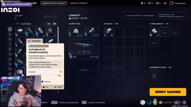 02:27:51Es wird die Unterscheidung zwischen dem 'Gratis-Loadout' (zufällige Gegenstände) und verbesserten Loadouts erklärt, die man durch Eintauschen von Beutemarken erhält. Der Streamer ist zunächst verwirrt über die Handhabung der Loadouts und die Lagerverwaltung, da sein Lager voll ist. Er erfährt, dass das Lager erweitert werden kann und entscheidet sich, weiterhin das kostenlose Loadout zu nutzen, um sich mit dem Spiel vertraut zu machen und nichts Wertvolles zu verlieren. Es wird auch die Währung 'Saatgut' erwähnt, die zum Einkaufen von Crafting-Teilen und -Materialien bei 'Celeste' verwendet wird. Die Gruppe plant, weiterhin auf der 'Noob-Map' zu spielen, um dort 'OP-Spieler' zu werden.