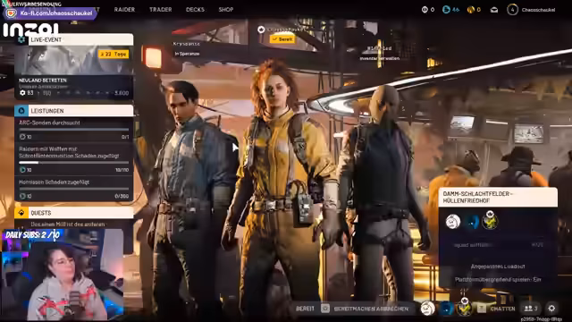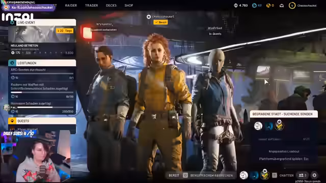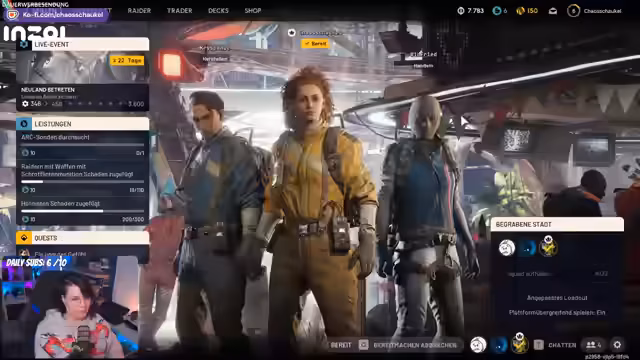 01:32:49Die Streamerin bereitet sich auf eine Spielesession des Extraction-Shooters 'Ark Raiders' vor, den sie zum ersten Mal spielt. Sie hat lediglich das Tutorial abgeschlossen und ist gespannt auf das Gameplay. Das Spiel wird als postapokalyptisch mit Robotern beschrieben, in dem Spieler Gegenstände sammeln und extrahieren müssen. Obwohl man andere Spieler nicht zwingend erschießen muss, ist die Streamerin auf PvP-lastiges Gameplay eingestellt und plant, wachsam zu sein. Sie spielt das Spiel zusammen mit zwei weiteren Personen, Chris und Winnie, und sie einigen sich darauf, dass Chris als Hauptredner fungiert, um mit anderen Spielern zu kommunizieren, da er gut Englisch spricht. Die Streamerin ist ein "Shoot-Noob" und erwartet, hektisch zu werden und die Kamera wild zu bewegen, wenn sie unter Beschuss gerät. Sie hat den Sound grob eingestellt und hofft, dass die Lautstärke im Stream passt. Die Gruppe plant, sich in einem privaten Discord-Kanal zu treffen, um ungestört zu sein und die Spielmechaniken gemeinsam zu erkunden.