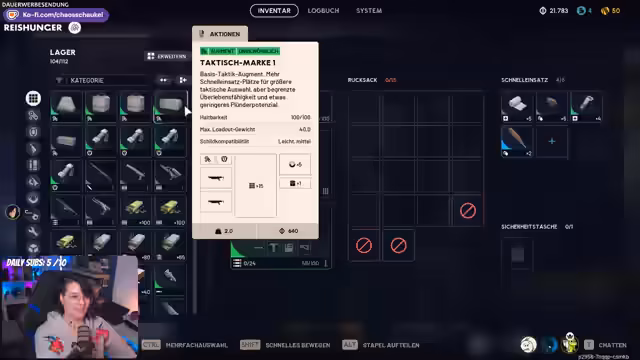 02:24:03Fokus liegt auf den Systemen des Spiels. Der Prozess des "Gratis-Loadouts" wird erläutert, das bei einem Händler gegen einen besseren Rucksack getauscht werden kann, der eine wertvolle Sicherungstasche besitzt. Diese Tasche schützt Items vor dem Verlust, falls der Spieler stirbt. Der Aufbau des Inventars mit den Tabs "Lager" und "Loadout" wird veranschaulicht. Es wird gezeigt, wie man Beutemarken und neue Gegenstände in das Loadout zieht. Ein Problem mit dem vollem Lager wird gelöst, indem es erweitert wird, und die Enttäuschung über das zufällige "Gratis-Loadout" wird geteilt.