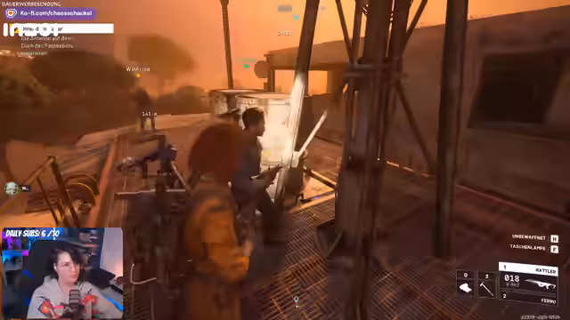 03:02:30Die Sicht ist aufgrund eines Waldbrandes stark eingeschränkt. Es werden Arcs gesichtet, die regelmäßig nachspawnen. Die Hintergrundgeschichte des Spiels wird kurz beleuchtet: Roboter haben die Welt übernommen, und die Menschen müssen überleben, was an ein Terminator-Szenario erinnert. Ein Spieler stirbt in der Nähe, was zu erhöhter Vorsicht führt. Die Gruppe trifft auf Axt-Gegner, wobei einer die Spieler bemerkt hat. Es wird betont, dass das Spiel trotz Schwangerschafts-Modus nicht toxisch ist. Eine Kurierlieferung wird abgeschlossen, und die Streamerin bemerkt, dass ihre Mitspieler 'kribbig' sind. Sie schaltet ein Discord-Abzeichen für das Spiel frei und installiert eine Waffenstation, um Waffen zu verbessern, wofür sie jedoch weitere Materialien benötigt.