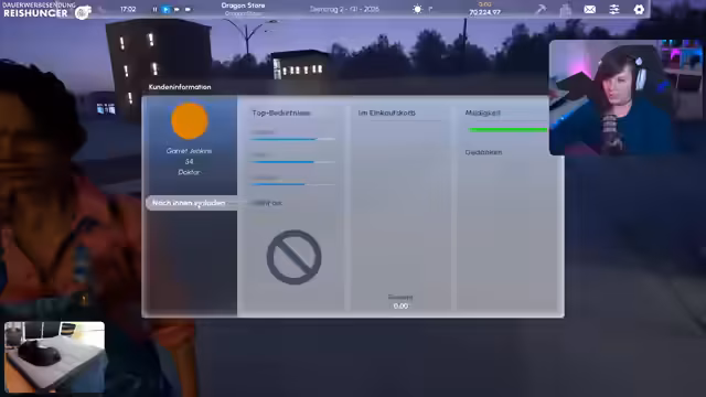02:17:01Das Geschäft eröffnet um 10 Uhr mit einer Marketingkampagne, die noch nicht vollständig implementiert ist. Es gibt drei Hauptphasen im Spiel: Morgens (noch nicht implementiert), Arbeitstag und Abends. Der Streamer interagiert mit den Kunden durch verschiedene Verkaufsstrategien wie Einladen, Gespräch und Kaltverkauf. Anfangs kommen nur wenige Kunden, was als realistisch beschrieben wird, da der Laden neu ist.