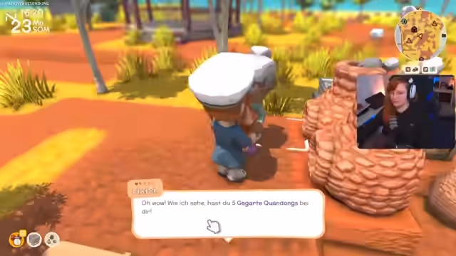 01:55:13Während des Gameplays in Dinkum läuft der Streamer immer wieder in Herausforderungen. Er versucht, Foto-Quests zu erfüllen, merkt aber, dass er dafür eine Kamera aus dem Museum kaufen muss, ohne die er die Questen nicht abschließen kann. Zudem stellt er fest, dass seine Werkzeuge extrem schnell kaputtgehen, was den Fortschritt bremst. Er beschließt, weiter Tiere zu fangen und Ressourcen zu verkaufen, um an Geld für das Haus zu kommen und seine Werkzeuge aufzufüllen.
