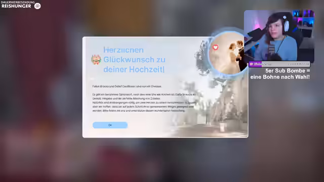 05:33:24Im Stream wird darüber gesprochen, dass man im Spiel nur schwängern kann, wenn man verheiratet ist, und dass man dafür möglicherweise eine Hochzeitsparty machen muss. Es wird überlegt, ob man nach der Schwangerschaft wieder scheiden lassen kann. Der Streamer interagiert mit anderen Soils, macht ihnen Komplimente und schenkt ihnen Gegenstände. Es wird ein Heiratsantrag gemacht und die Verlobung gefeiert. Anschließend wird überlegt, wie man die Ehe wieder beenden kann. Der Streamer äußert den Wunsch, die Welt mit grünen Soils zu bevölkern, indem er mehrere Mädels heiratet, schwängert und sich wieder scheiden lässt. Es wird diskutiert, ob man die Ehepartnerin einfach rausschmeißen kann oder ob sie dann ihr Geld mitnimmt. Der Chat gibt Tipps, wie man die Beziehung beenden kann. Der Streamer versucht, die Familienbeziehung zu seiner Frau im Spiel zu verschlechtern, um eine Scheidung zu provozieren.