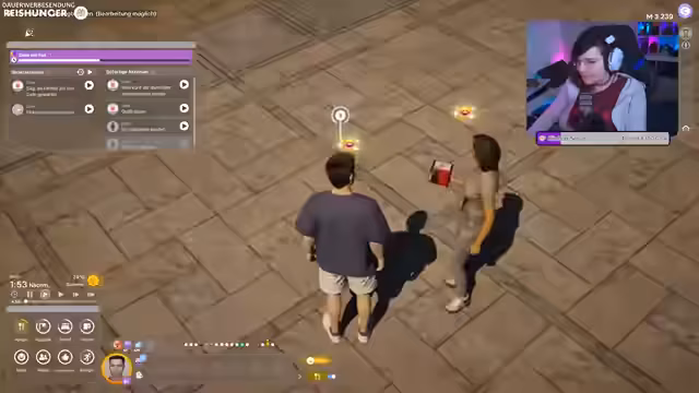 00:47:20Nach einigen technischen Vorbereitungen und Grafik-Anpassungen beginnt das eigentliche Gameplay in Inzoi. Der Streamer möchte mit Winnie einen neuen, nicht-Rabbit-Hole-Shop finden und entscheidet sich für den Reporter-Job. Es wird versucht, mit Feli zu flirten, die im Lieblingspark getroffen werden soll. Dabei werden technische Probleme mit dem Overlay erwähnt, das ständig verschoben werden muss.