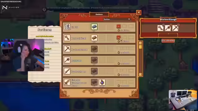 02:09:01Das Inventar wird neu organisiert. Die DLC-Boxen, die bei jedem neuen Spielstart erscheinen, werden gesichtet, wobei wertvolle Mounts behalten und der Rest verkauft wird. Nach dem Schmieden eines Hammers und dem Craften der ersten Schlüssel wird ein Test der neuen Waffe geplant. Aufgrund zu niedriger Kampfstufe kann diese jedoch noch nicht genutzt werden. Der Stream endet mit der Vorbereitung auf den nächsten Tag, der Besuch bei Kitty und der Mine ist geplant.