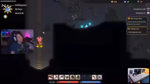 02:24:24Ein Trip in die Mine stand auf dem Plan, um das erste Gatter permanent zu öffnen und bessere Schlüssel zu finden. Die Mine im Spiel wurde positiv bewertet, da sie im Vergleich zu anderen Spielen wie Stardew Valley als weniger frustrierend und sogar als belohnend empfunden wird. Die Gegner wurden als nicht übermäßig gefährlich und der generierte Loot als wertvoll angesehen. Trotzdem wurde betont, dass der Streamer aufgrund des noch fehlenden Multiplayer-Modus nicht regelmäßig in die Mine geht.