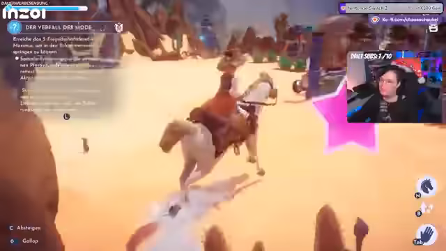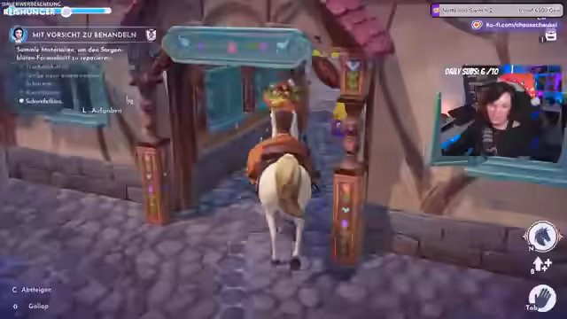 02:56:39Die Konzentration verlagert sich auf das Leveln der neu erworbenen Reittiere. Es wird geprüft, ob jedes Pferd ein eigenes Level besitzt, und herausgefunden, dass 'Maximus' unabhängig vom Hauptpferd 'Findus' leveln kann. Dazu müssen tägliche Aufgaben wie Füttern, Streicheln und Bürsten erledigt werden. Der Streamer sucht nach den richtigen Rezepten für die spezielle Fütterung von Maximus und bereitet sich vor, diese bald anzuwenden, um das Level zu steigern.