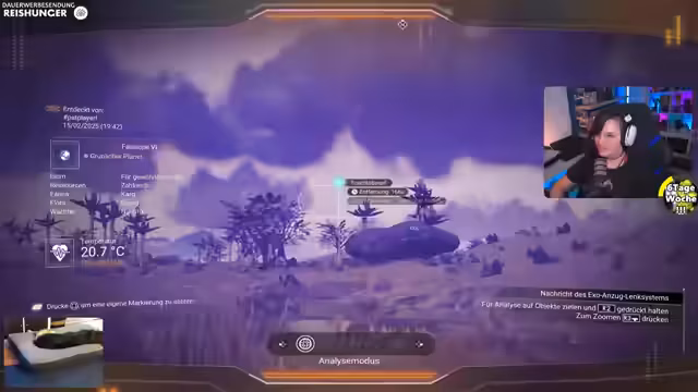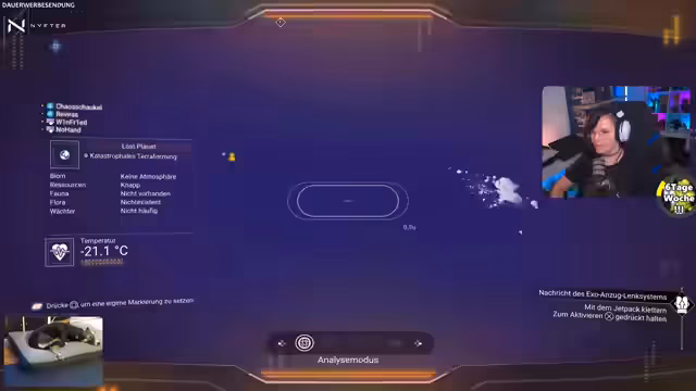 05:47:31Auf dem neuen Planeten wird der Streamer fündig. Es handelt sich um einen Deko-Planeten, auf dem man verschiedene Deko-Elemente sammeln kann. Er ist begeistert von der Schönheit des Planeten, insbesondere von den chromatischen Metallen, die er abbauen kann. Parallel dazu sucht er nach einem Objekt für eine Quest, wobei er anfangs Probleme mit der Navigation hat und das Ziel nicht direkt identifizieren kann. Er findet ein rotes, leuchtendes Objekt, das ihm in den Weg steht und sich nicht mitnehmen lässt.