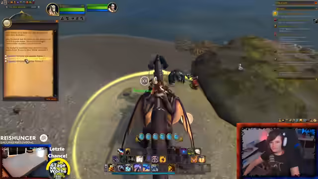 01:30:14Der Stream setzt mit dem Questen in der Region Warbif Inn fort. Der Streamer erwähnt, dass sein liebster Teil des Levelns das Questen ist, da Dungeons ihn schnell langweilen. Plötzlich stellt er fest, dass die Quests nicht mehr automatisch im Questlog angezeigt werden, was er als "nervig" und "böse Bug" bezeichnet. Nach einem kurzem Tausch und mit der Hilfe der Community wird das Problem durch einen Chat-Befehl behoben, der das automatische Verfolgen der Quests wieder aktiviert.