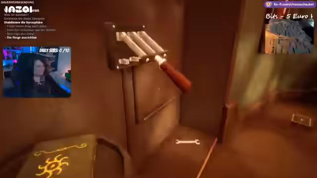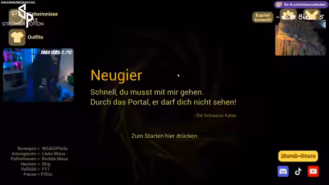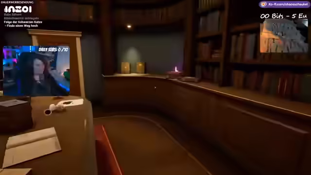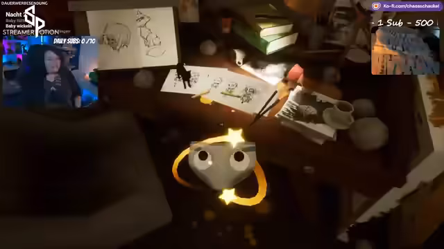02:12:22Ein neues Kapitel beginnt. Die Streamerin und das Hasenmotiv 'Hasi' sind auf dem Dachboden. Eine Katze taucht auf und scheint als Verbündete zu fungieren. Gemeinsam folgen sie der Katze durch ein Portal. Sie entdecken eine Aufzeichnung, die zeigt, wie jemand vor dem Baby geflüchtet ist. Die Aufgabe besteht darin, weitere Bücher zu finden, um die Welt zu verändern. Die Katze führt sie in ein Laborartiges Gebiet, wo sie Roboter reparieren und Rätsel mit Farbkugeln und magnetischen Flaschen lösen muss, um weiterzukommen.