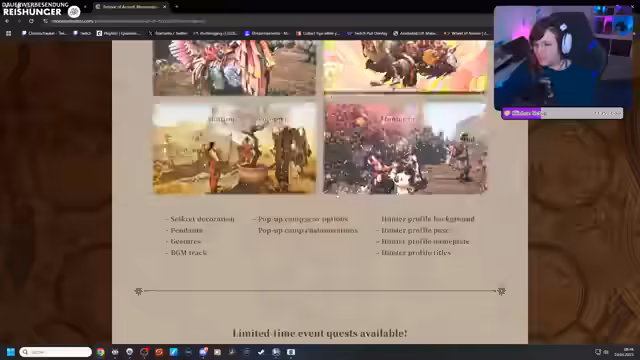 00:56:06Nach verschiedenen Themenblöcken startet der Streamer endlich mit dem Spielen von Monster Hunter Wilds. Er präsentiert die Details des 'Blossom Dance'-Events, das bis zum 7. Mai läuft. Es gibt neue Skins, darunter ein asiatisches Outfit und ein Schmetterlings-Set, sowie diverse Camp-Anpassungen und eine Namensplatte. Der Streamer zeigt sich begeistert von den Inhalten, insbesondere von den süßen Kätzchen-Anhängern, ist aber unsicher, ob er die im Shop einzeln erhältlichen DLCs für 1,50 Euro kaufen wird. Er erklärt, dass er mit seiner Gilde keine Quest machen kann, da diese voll ist, und stattdessen eine öffentliche Lobby mit Passwörtern für die Chat-Teilnehmer einrichten wird, um jedem den Beitrag zu ermöglichen.